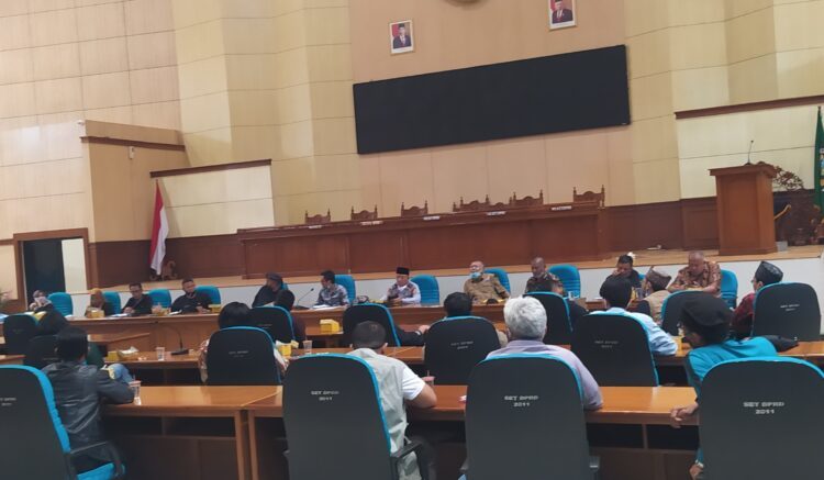 Komisi III memediasi AMPEG bertemu dengan Dinas Perizinan, Pariwisata, LH, Tarkim, Perhubungan, Balai Pengawas Pertambangan, dan BPBD; di ruang paripurna DPRD.