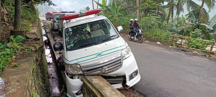 Diduga supir ngantuk berat, mobil yang membawa jenazah dari RSUD SMC menuju Taraju nyungseb di Kampung Cimanik, Desa Deudeul, Kecamatan Taraju, Kabupaten Tasikmalaya, Senin (25/01/2021).