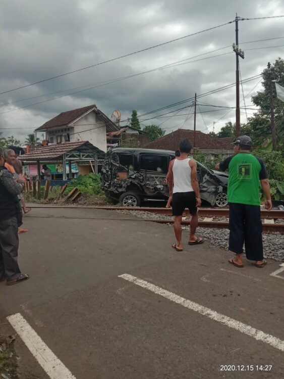 Sebuah mobil minibus berwarna hitam bernopol B 2069 TKG terseret sepanjang 10 meter di pintu lintasan kereta di Kecamatan Manonjaya, Kabupaten Tasikmalaya, Selasa (15/12/2020).