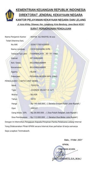 Bahkan surat keterangan identitas mobil yang ditawarkan dengan kop surat KPKNL atas nama Ali Rasyid sebagai penjamin juga ada dan dilampirkan dibagikan juga.