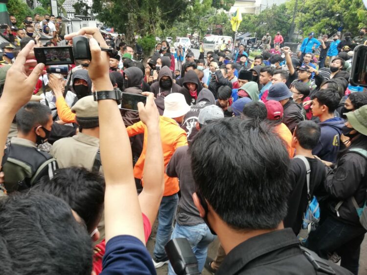 Aksi ratusan mahasiswa menolak RUU Omnibus Law dari program legislasi nasional (prolegnas) berlangsung panas di kantor Dewan Perwakilan Rakyat Daerah (DPRD) Kota Sukabumi di Jalan Ir. Djuanda Kota Sukabumi, Kamis (16/7/2020).