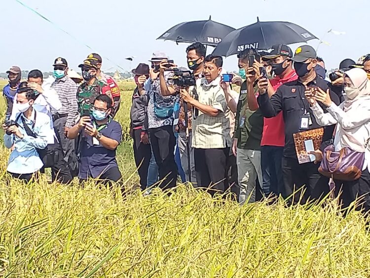 Tampak hadir Menteri Pertanian RI, Dr. Syahrul Yasin Limpo, SH, M. Si, MH. didampingi Dirjen Tanaman Pangan Kementan RI, Dr. Ir. Suwandi, M. Sc; Kadis Pertanian Pangan dan Hortikultura Prov. Jabar, Ir. Dadan Hidayat, M. Si; Plt. Bupati Indramayu, Drs. H. Taufik Hidayat; Kapolres Indramayu, AKBP Suhermanto, S. Ik, dan pemangku kebijakan lainnya.