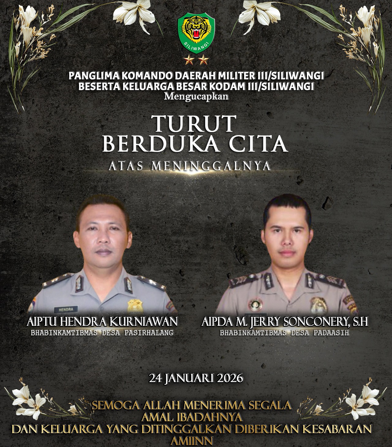Sebagai bentuk tanggung jawab moral dan solidaritas, jajaran Kodam III/Siliwangi bergerak cepat melaksanakan takziah ke rumah duka. Irdam III/Siliwangi, Brigjen TNI Nurul Yakin, M.A., hadir mewakili Pangdam untuk menyampaikan belasungkawa langsung kepada keluarga Ipda (Anumerta) Hendra Kurniawan dan Aiptu (Anumerta) Muhammad Jerry Sonconery.