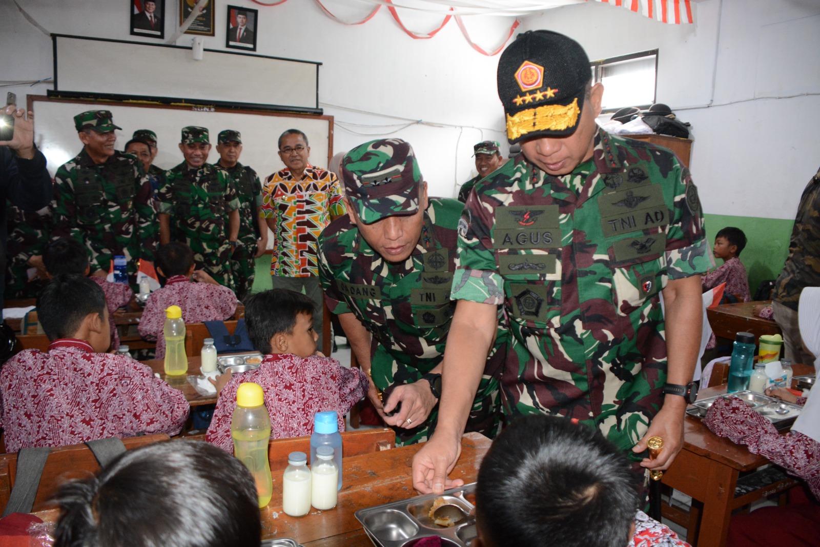 Pada kesempatan tersebut, Panglima TNI masuk dan melihat suasana kelas saat anak-anak menikmati menu MBG.