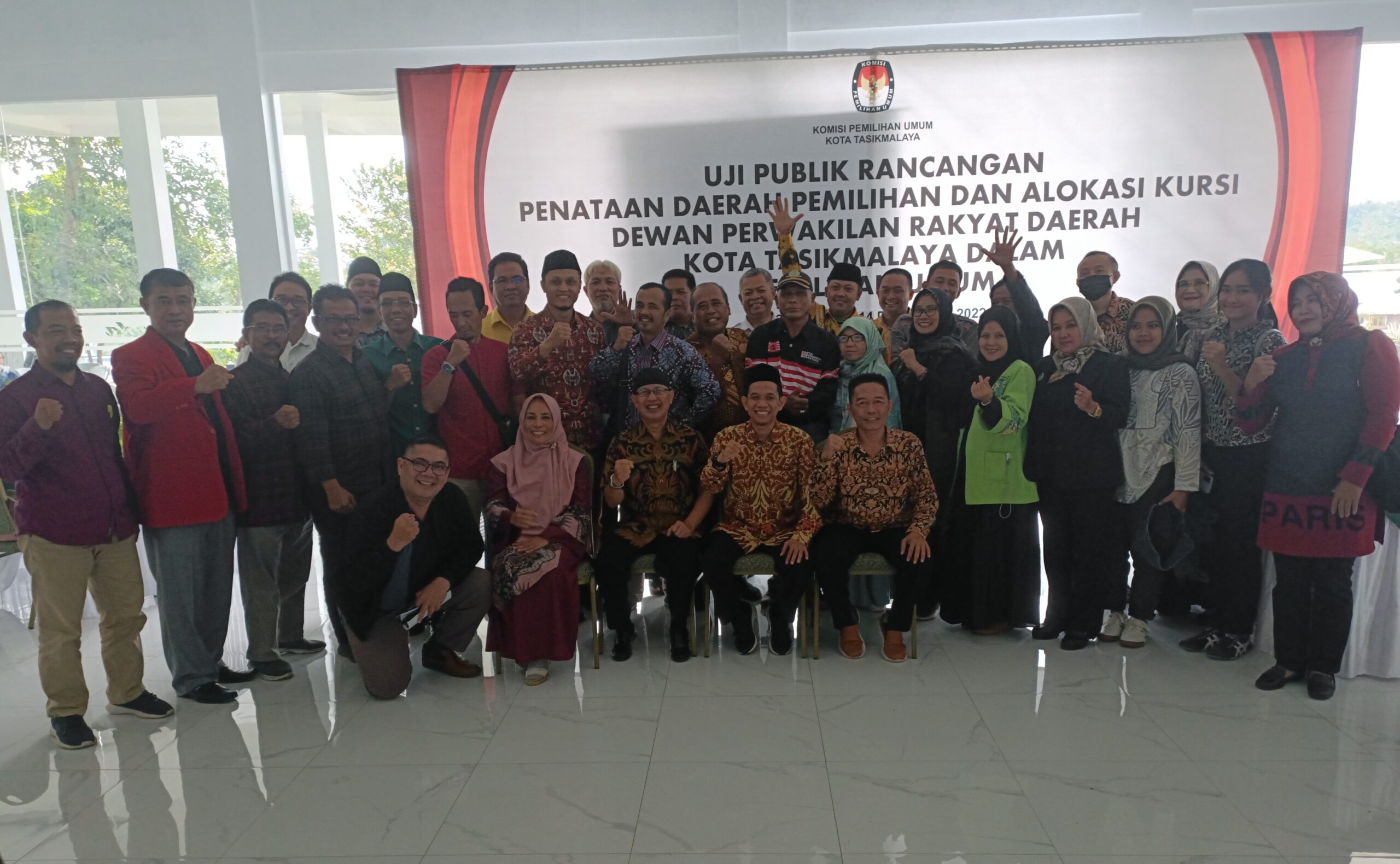 Parpol, tokoh masyarakat dan penyelenggara pemilu Kota Tasikmalaya melakukan uji publik penataan dapil dan alokasi kursi DPRD Kota Tasikmalaya di RM Ocoh, Rabu (14/12/2022).*