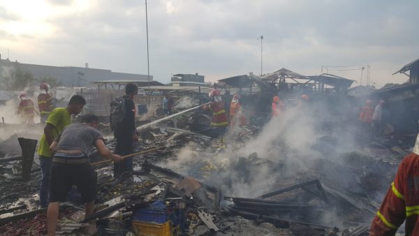 Warga pasar berupaya memadamkan api dengan air seadanya sebalum 3 unit pemadam kebakaran diterjunkan.