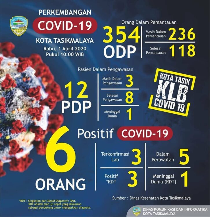 Kabar baik datang dari pasien positif K-01 di Kota Tasikmalaya. Per 1 April ini kondisi membaik dan menunggu hasil laboratorium untuk memastikan sembuh dari virus corona.