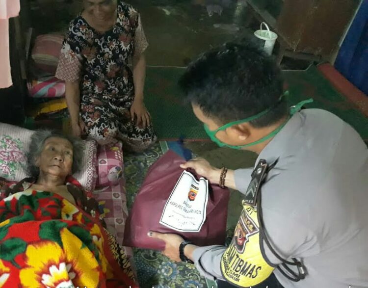 Kali ini, mereka mendatangi puluhan warga jompo untuk membagikan sembako. Penerima menyambut gembira kedatangan petugas Kepolisian.
