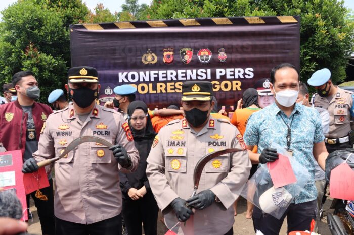 “Penangkapan para pelaku berawal dari beredarnya video viral di media sosial instagram terkait aksi pelaku yang sadis melukai korban berinisial E hingga mengalami luka berat, dari itu dilakukan penyelidikan dan diamankan enam pelaku.”, ungkap Kapolres Bogor Polda Jabar AKBP Dr. Iman Imanuddin