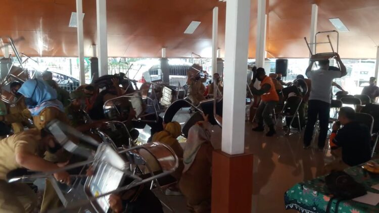 Mereka berhamburan keluar dari ruang tersebut memperagakan seolah terjadi bencana, dipandu Badan Penanggulangan Bencana Daerah Kabupaten Sumedang.