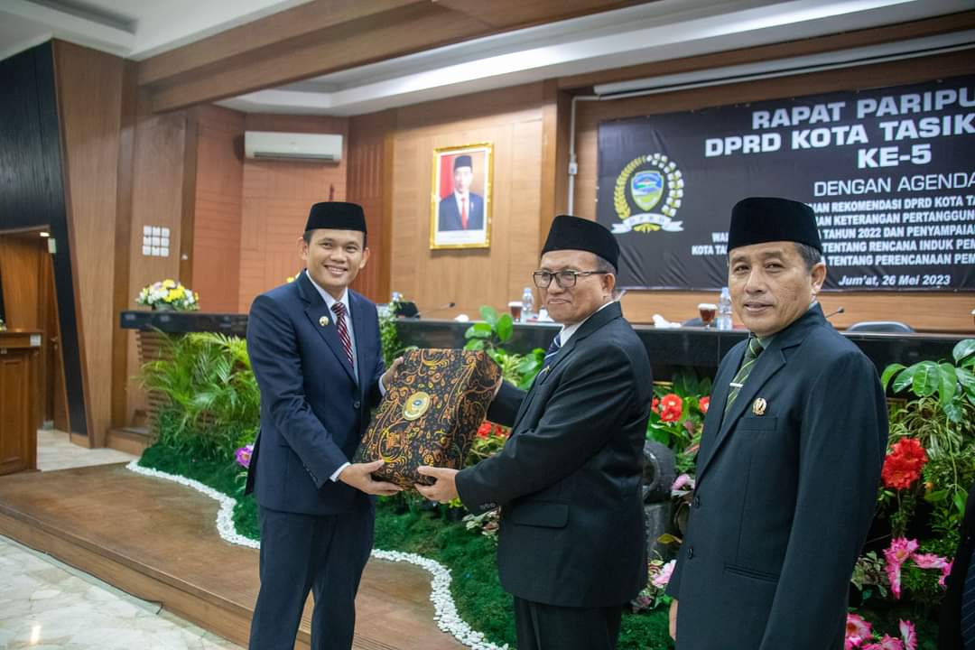 Penyerahan jawaban atas pandangan fraksi dari Pj Wali Kota Tasikmalaya Cheka Virgowansyah kepada DPRD Kota Tasikmalaya terkait dua ranperda, Jumat (26/5/2023).*