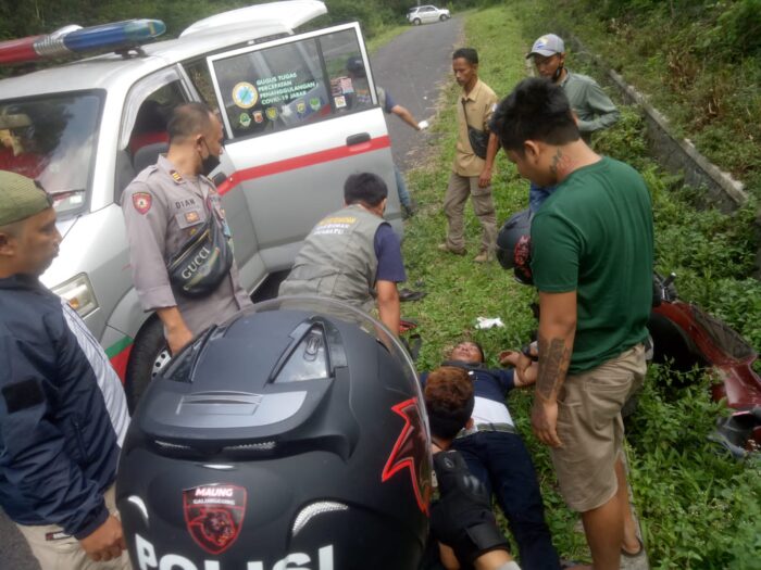Diduga rem motor berplat nomor Z 3711 PC blong dan keduanya terjatuh.