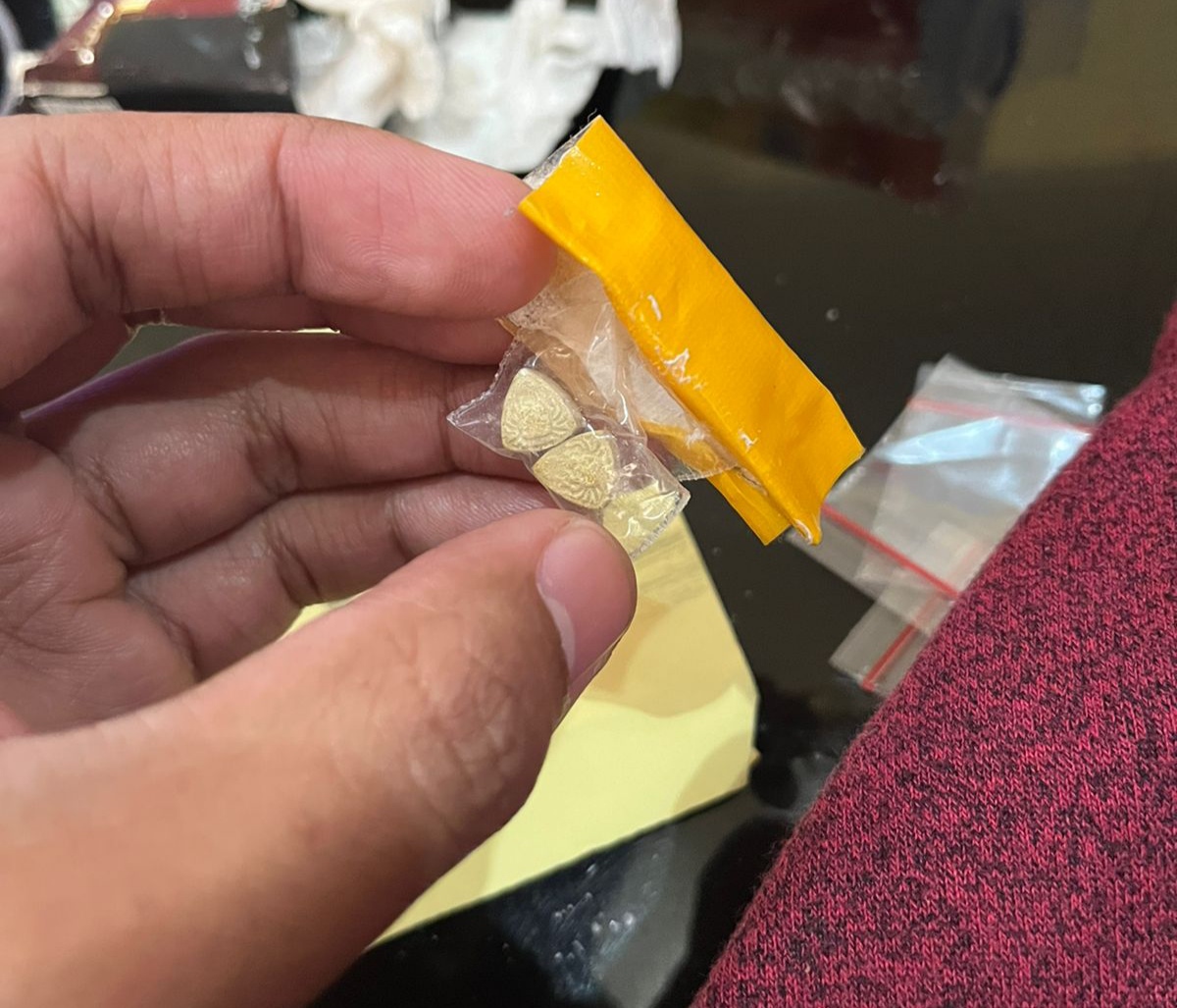 Saat dibuka, bungkus tissue tersebut berisi 1 (satu) unit handphone, 1 (satu) unit charger, dan 3 (tiga) buah kartu perdana. Sedangkan pada bungkus rokok ditemukan 2 (dua) bungkus narkotika jenis sabu dan 2 (dua) butir ekstasi.