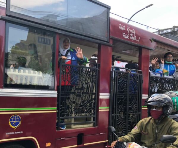 Usai ramah-tamah, atlet langsung diarak keliling perkotaan Kota Tasikmalaya menggunakan bus wisata ngulisik.