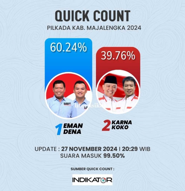 KAPOL.ID – Perolehan suara Eman-Dena 60,24 persen, Karna – Koko 39, 76 persen berdasarkan Quick count atau hitung cepat Pilkada Majalengka versi Lembaga Survei Indikator.