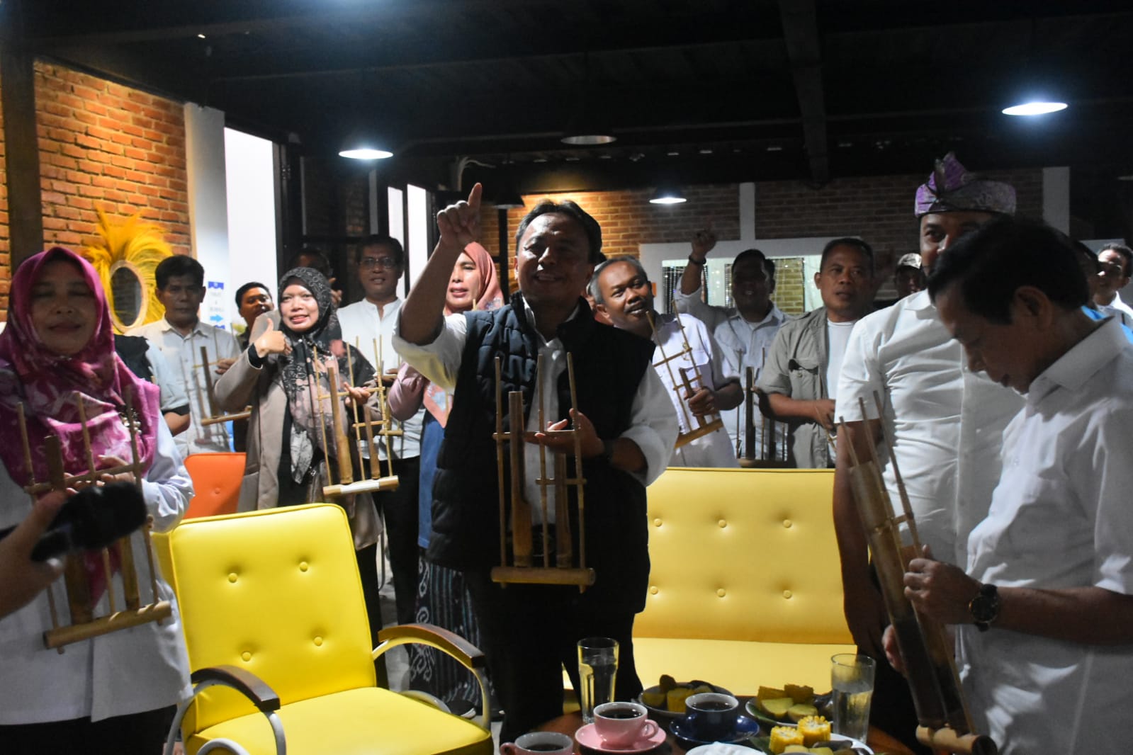 Kali ini, mengajak para camat memainkan angklung saat konsolidasi dengan para camat dan kepala SKPD di Taman Seribu Cahaya, Jatigede, Rabu malam, (11/10/2023).