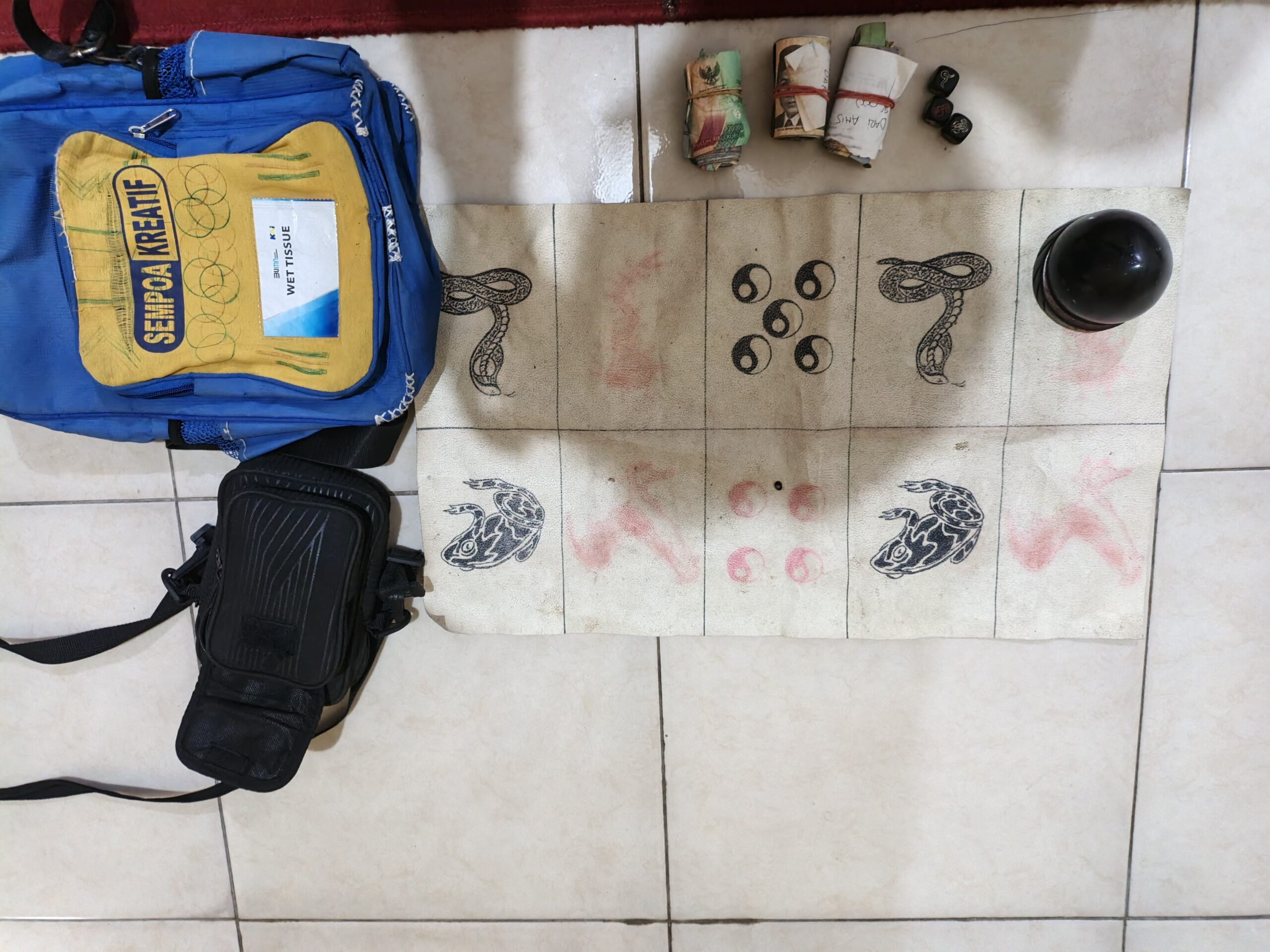 Dari lokasi kejadian, polisi menyita sejumlah barang bukti di antaranya satu lembar kain bergambar hewan, tiga buah dadu, satu tempurung kelapa, serta uang tunai senilai Rp 264.000 yang diduga sebagai uang taruhan.