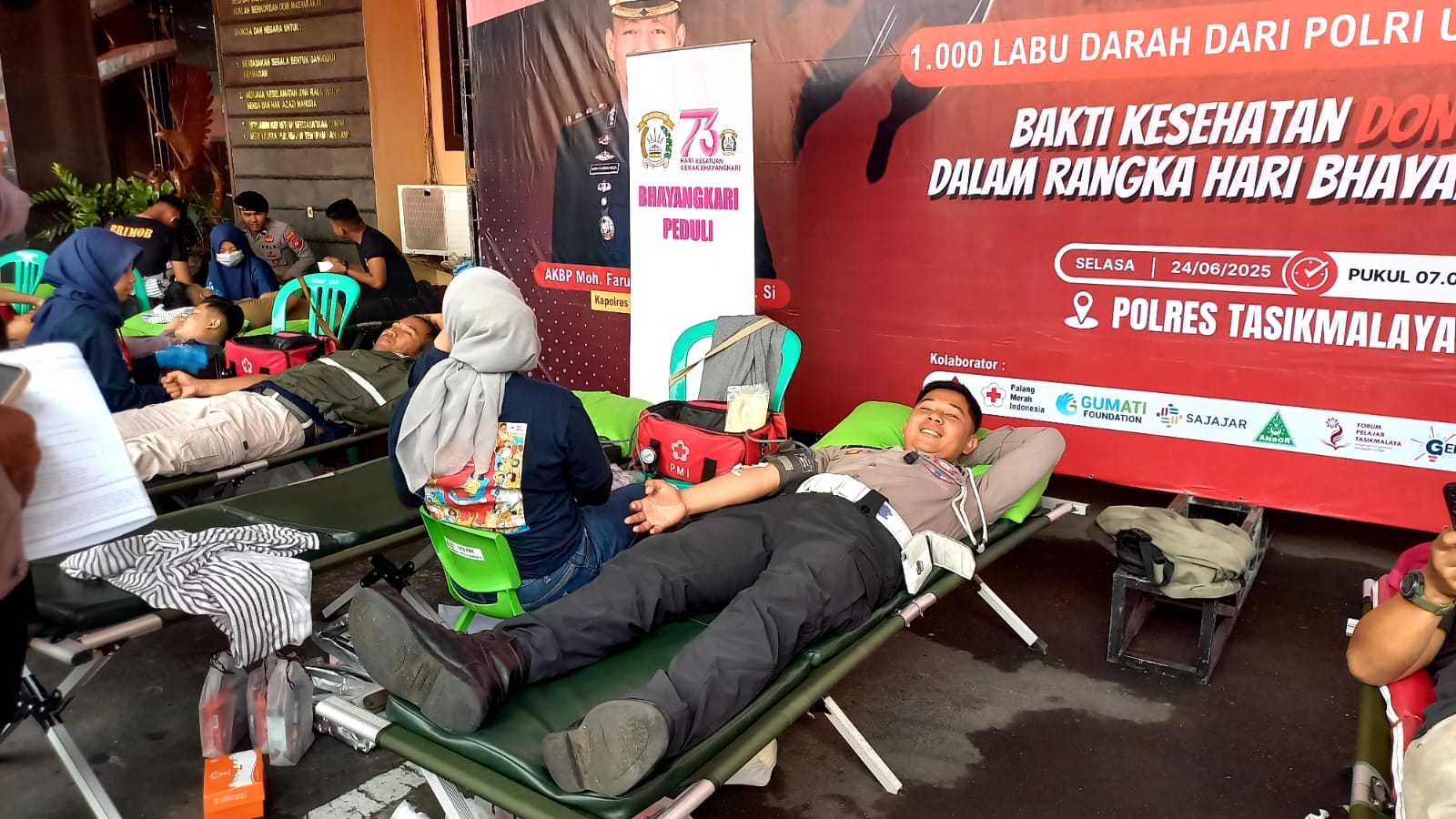 Rangkaian HUT ke 79 Bhayangkara diisi dengan donor darah di Mapolres Tasikmalaya Kota, Selasa (24/6/2025). Tak tanggung-tanggung, target 1.000 pendonor darah ikut berpartisipasi.