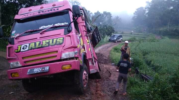 Saat ini pemilik truk dan kenetnya dibantu warga sekitar, berupaya mengevakuasi agar keluar dari jalan yang amblas.