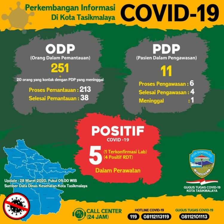 Penemuan kasus positif terinfeksi virus corona bertambah empat orang dalam dua hari terakhir di Kota Tasikmalaya. Per 28 Maret 2020 ini total keseluruhan lima pasien diisolasi di rumah sakit.