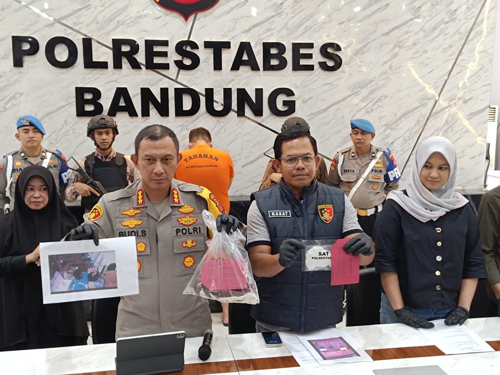 Tersangka atau pelaku berinisial FA. Pelaku pun tertunduk malu ketika dipamerkan di depan media di Polrestabes Bandung dengan mengenakan pakaian berwarna orange bertuliskan tahanan.