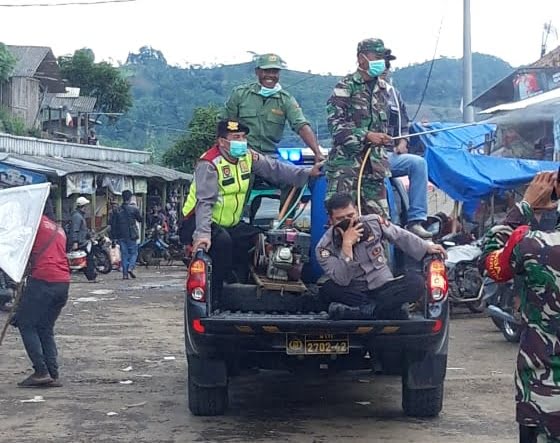 Tim gabungan kemudin melanjutkan penyemprotan menggunakan mobil dinas polsek taraju dimpin langsung Danramil 1221 Taraju , Kapten Czi.Rohadi.