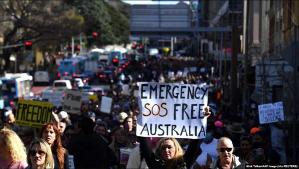 Penyelenggara menyebut demonstrasi itu sebagai aksi kebebasan. Para peserta mengusung poster dan spanduk bertuliskan “Bangun Australia” dan “Sikat habis korupsi.”