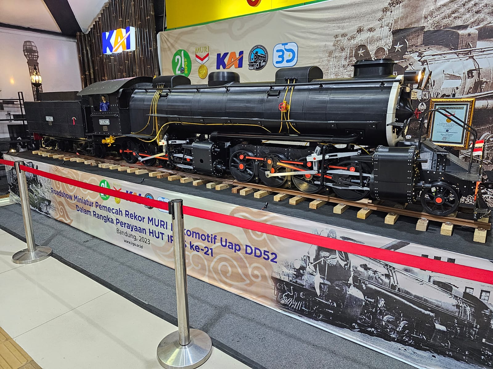 KAPOL.ID – Miniatur cetak tridimensi Lokomotif Uap seri DD5208 pemecah rekor MURI sebagai ukuran miniatur terbesar di Indonesia dipamerkan di Stasiun Bandung.