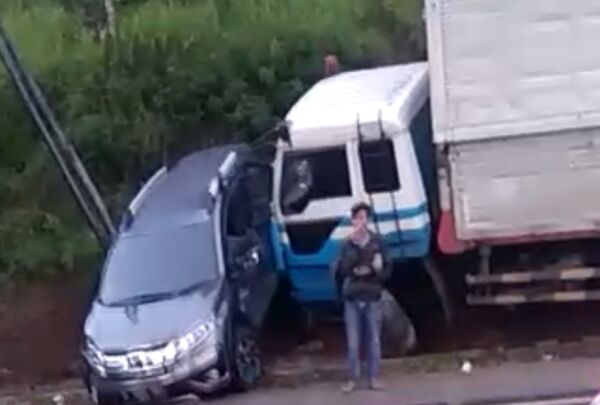 Truk baru terhenti ketika mobilio yang berada di depannya menyangkut di tiang telepon.