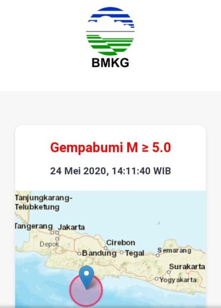 Gempa berskala 5,1 Magnitudo terjadi saat hari Idulfitri di 90 km barat daya Kabupaten Pangandaran, Minggu (24/5/2020).