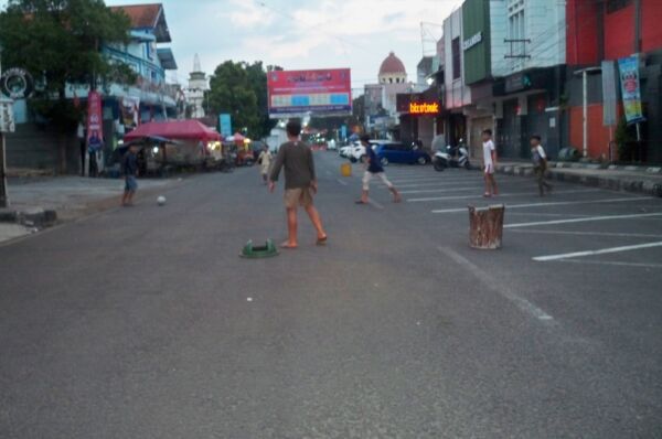 Demikian pula di depan Gedung KNPI sebagai tempat kuliner yang biasanya selalu dikerumuni masa. Minggu sore hanya terlihat sekelompok anak kecil yang dengan bebas bermain bola di tengah jalan.