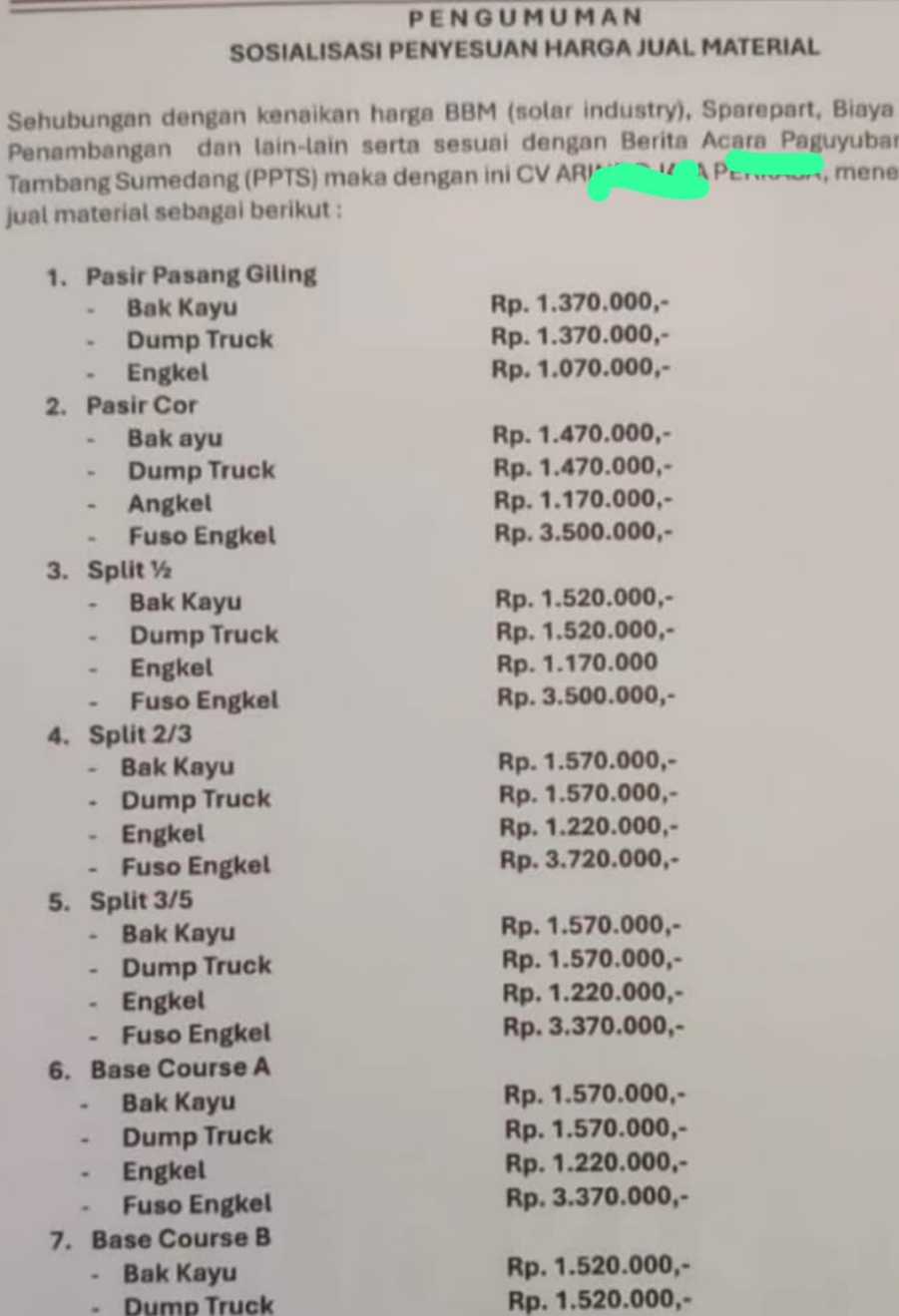 SUMEDANG, KAPOL.ID – Eskalasi biaya operasional di sektor hulu pertambangan akhirnya mencapai titik didih. Salah satu perusahaan penyedia bahan material resmi mengumumkan penyesuaian tarif jual berbagai komoditas material bangunan, menyusul beban biaya produksi yang kian mencekik.