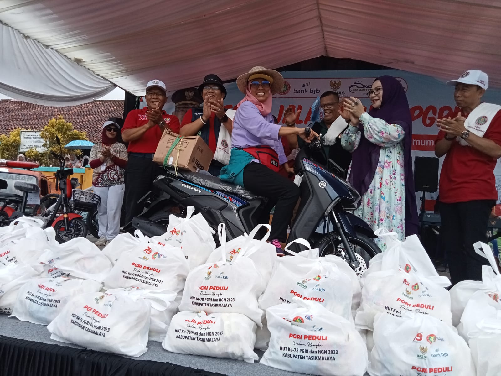 Ibu Iis pemenang undian motor, jalan santai HUT PGRI tingkat Kabupaten Tasikmalaya tahun 2023, Selasa (21/11/2023).*