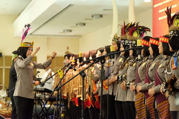 “Pada acara penyerahan bunga tangan, tampak Pakor Polwan AKBP. Dra. Wiwik Indrawati, Aptk.MARS, memakai baju tradisional Papua lengkap dengan hiasan kepalanya,” kata Kabid Humas Polda Jabar, Kombes Trunoyudo Wisnu Andiko.