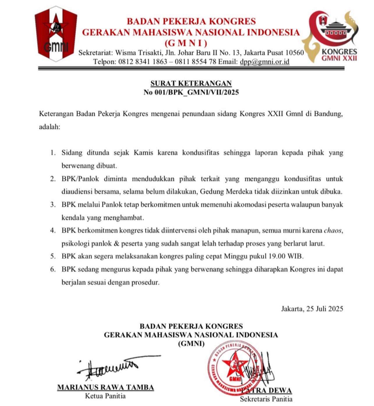 KAPOL.ID — Badan Pekerja Kongres (BPK) Gerakan Mahasiswa Nasional Indonesia (GMNI) buka suara terkait adanya penundaan kelanjutan Kongres XXII di Kota Bandung.