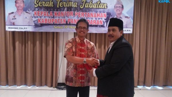 PANGANDARAN, (KAPOL).- Selasa, 22 Oktober 2019, digelar serah terima jabatan (Sertijab) Kepala Kantor Badan Pertanahan Nasional (BPN) Kabupaten Pangandaran dari Agus Sumiarsa SH.,M.Hn yang beralih tugas ke Kab Sumedang kepada Muhammad S.Sos M.Si yang semula menjabat di Kota Manado Sulawesi Utara.