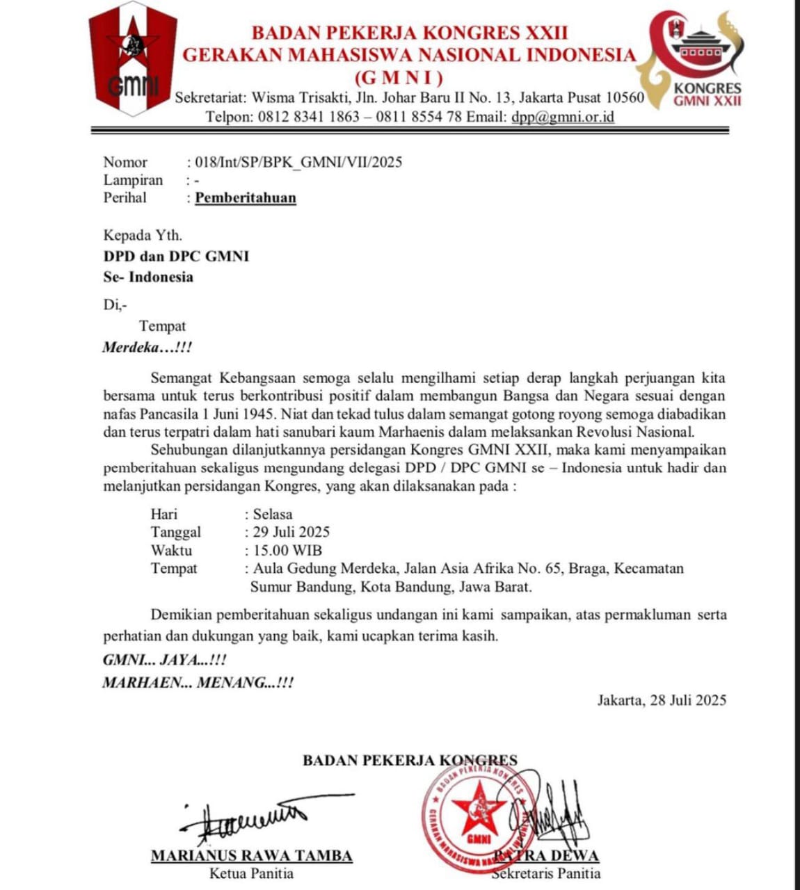 “Sehubungan dilanjutkannya persidangan Kongres GMNI XXII, maka kami menyampaikan pemberitahuan sekaligus mengundang delegasi DPD/DPC GMNI se-Indonesia untuk hadir dan melanjutkan persidangan Kongres,” tulis panitia dalam surat resmi tersebut dilihat, Selasa (29/7/2025).