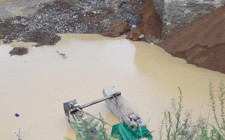 Tanggul penahan di lokasi galian tambang pasir ambrol. Menurut saksi mata, Hikmat, saat itu enam orang sedang berada di bawah. Tampak rembesan lumpur pada tanggul.