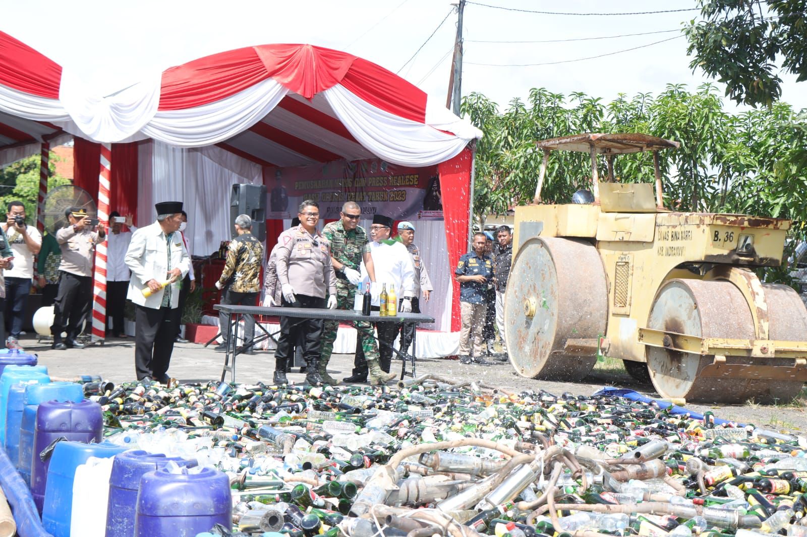 Pemusnahan barang bukti berupa miras disaksikan Forkopimda Kab. Indramayu