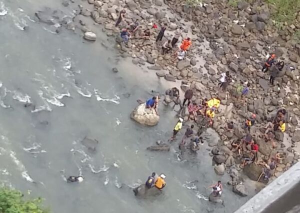 Karena jauh berada di dasar sungai, jasad korban disebrangkan dengan diikat tali. Lalu dimasukan ke kantung jenazah dan keranda.