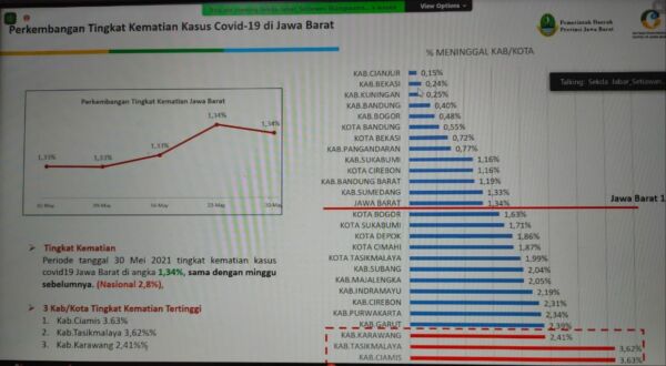 KAPOL.ID–Pemerintah Provinsi Jawa Barat (Jabar) merilis perkembangan tingkat kematian kasus Covid-19. Per tanggal 30 Mei 2021, tingkat kematian dampak Covid-19 di Jabar sebesar 1,34%.