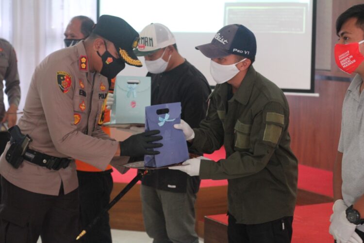Dalam kesempatan tersebut, kapolres memberikan penghargaan berupa plakat dan bantuan berupa cindra mata serta santunan terhadap korban longsor.