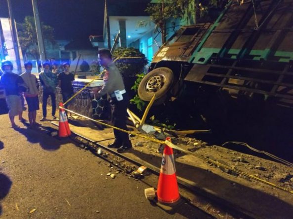 TASIK, (KAPOL).- Sebuah truk tronton terjungkal dan terperosok ke lubang galian kabel di kawasan jalan IR H Juanda tepatnya di jembatan Cimulu dekat klinik Avicenna Kelurahan Bantarsari Kecamatan Bungursari Kota Tasikmalaya, Sabtu (7/9/2019) tengah malam sekitar pukul 00.15 WIB.