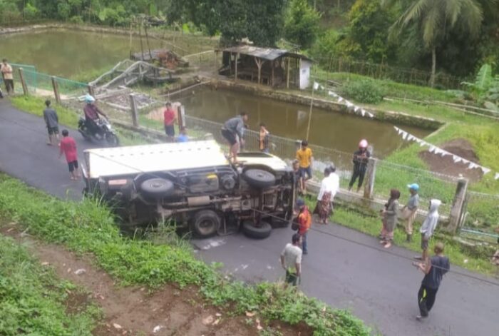 “Ketika sampai di TKP yang jalanya menikung ke kiri, mobil berbelok terlalu ke kiri, dan ketika akan dibanting ke kanan mobil yang melaju kencang malah terguling,” kata Kapolsek.