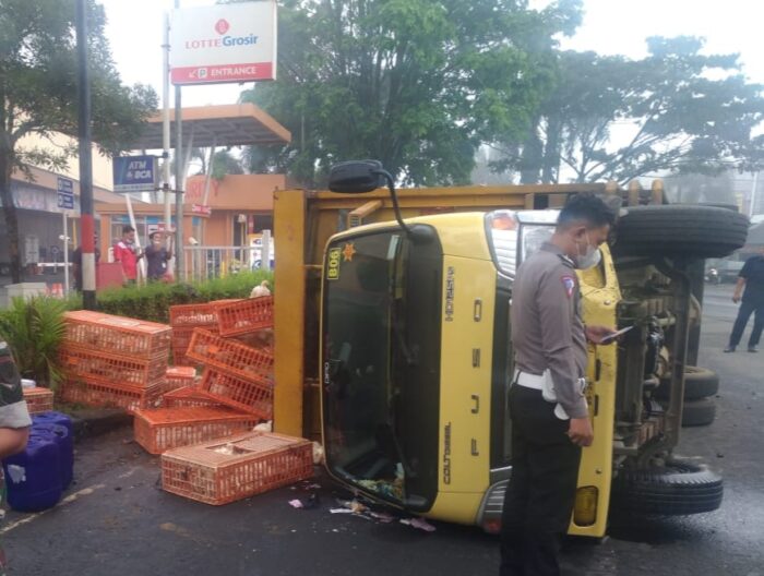 Truk bernopol Z 9858 MN ini baru berhenti setelah posisinya terguling dan menumpahkan muatan ayam boiler hidup.