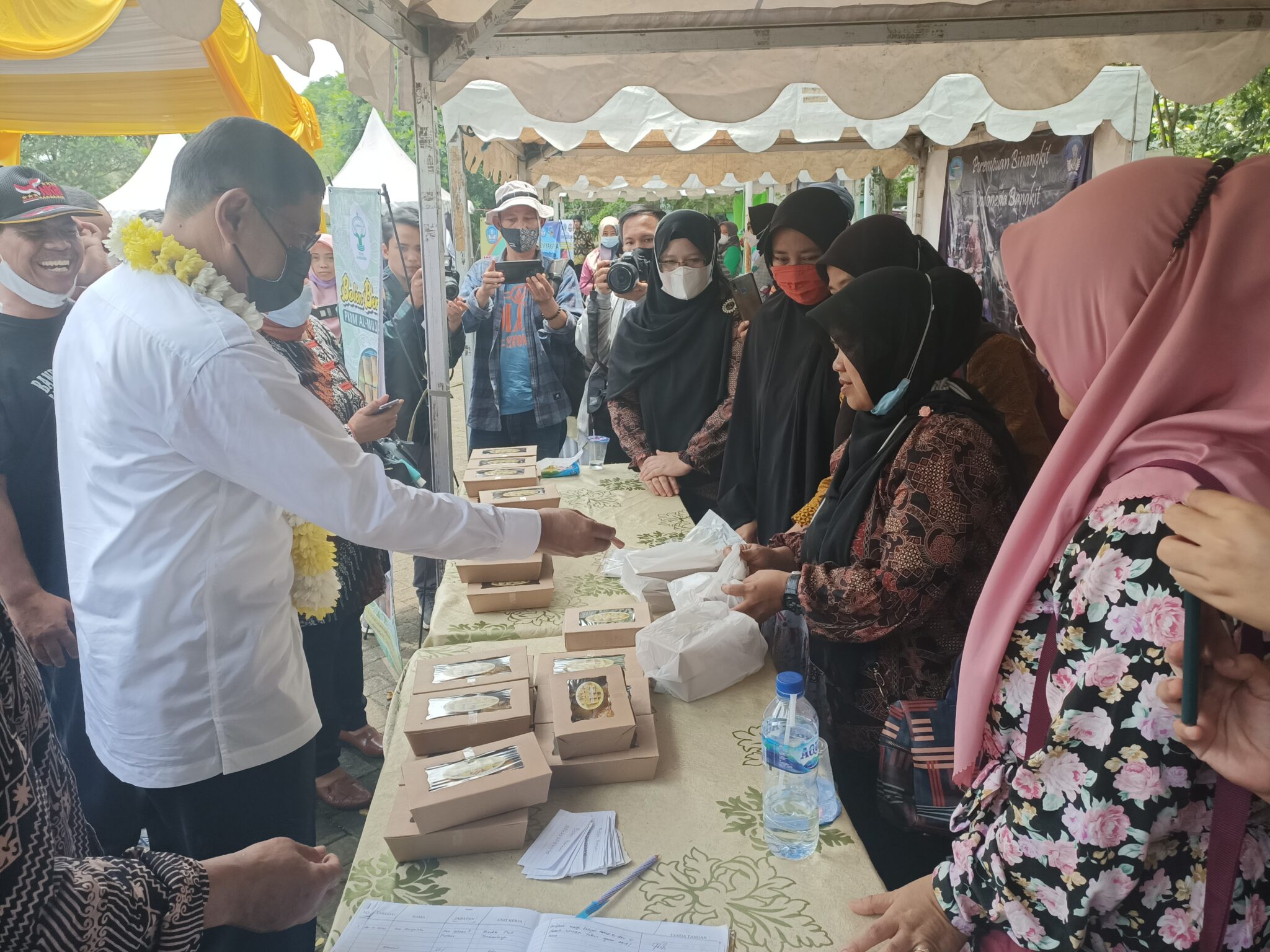 Wali Kota Tasikmalaya, H. Muhammad Yusuf belanja produk UMKM saat menghadiri acara Gerakan Pendidikan Pemberdayaan Perempuan Kota Tasikmalaya di Halaman Parkir Gedung Kesenian Tasikmalaya, Rabu (27/10/2021).